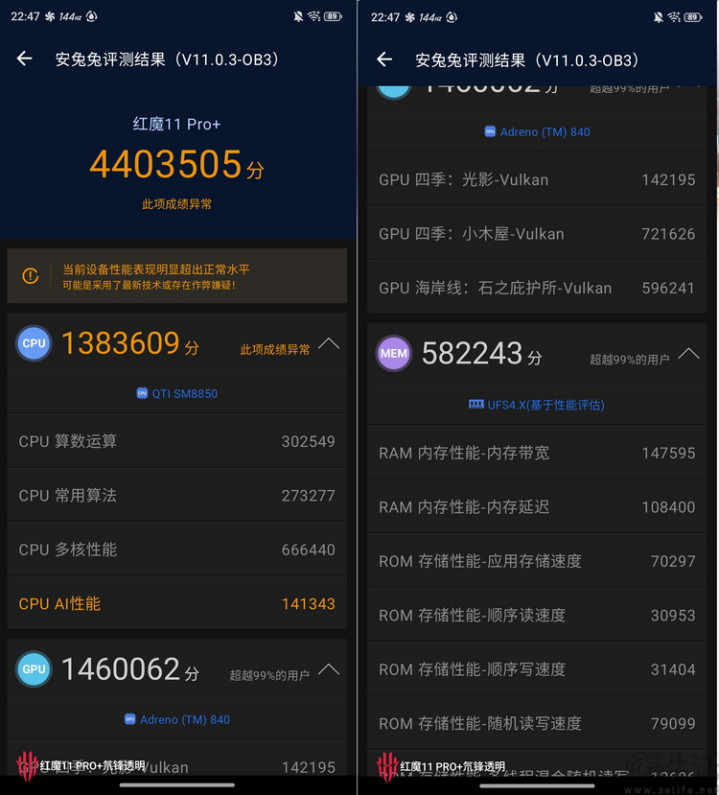 在此基础上,红魔11 PRO+还同时使用了包括“4D冰阶VC”、“液态金属导热垫”、“驭风4.0”散热风扇,以及“脉动水冷引擎”在内的一系列导热、散热措施组成的“ICE魔冷散热系统”。那么在它的帮助下,红魔11 PRO+的理论性能表现如何呢?