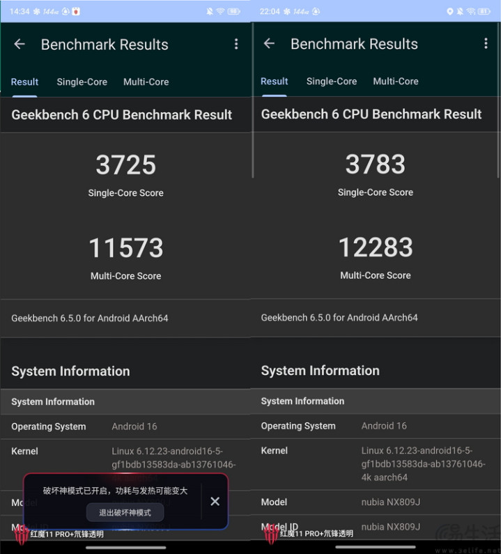 GeekBench 6.4常温(左)、低温(右)成绩
